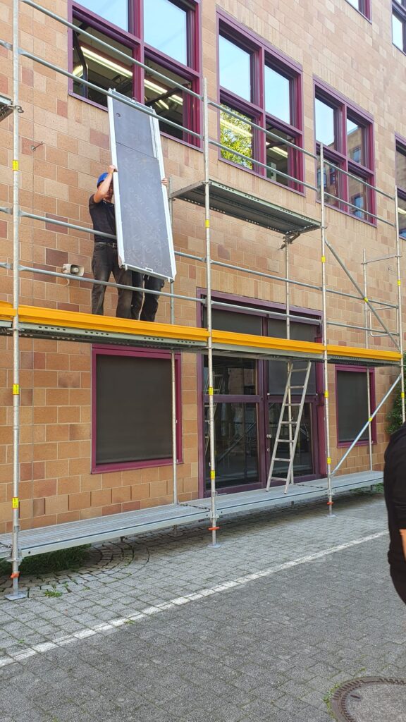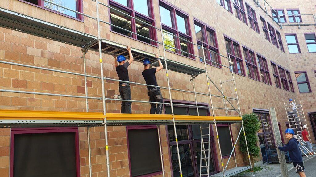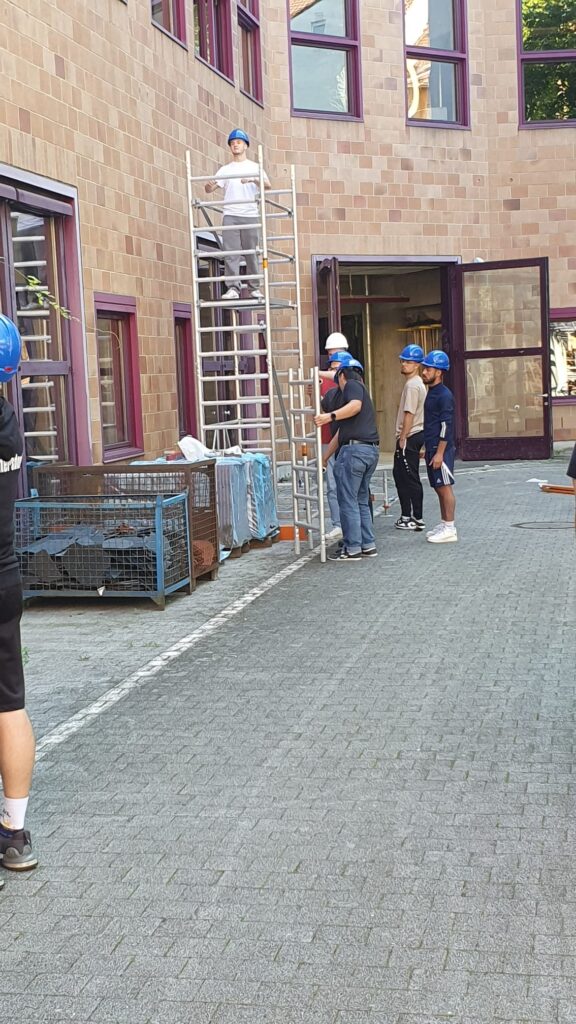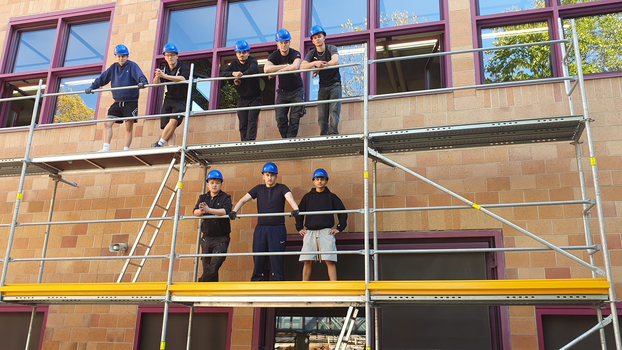 Wir starten mit einigen Impressionen aus der Werkstatt von Falk Pflugbeil. Die Klasse B3FS der Fliesenleger genießt die letzten Sonnenstrahlen beim Gerüstbau.
