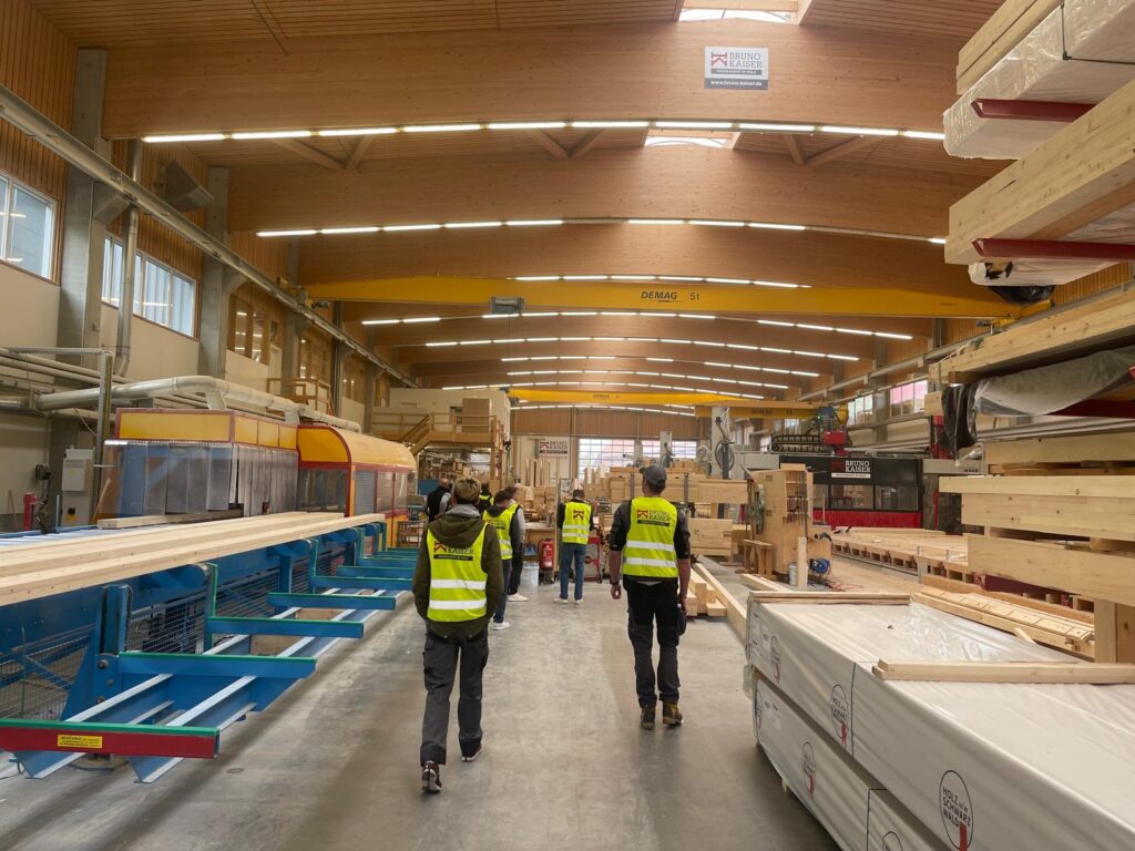 Bei Holzbau Bruno Kaiser durften die angehenden Zimmerermeister den Betrieb besichtigen und es wurde viel über Holz als Rohstoff gelernt.