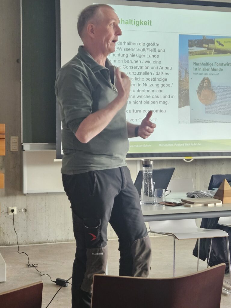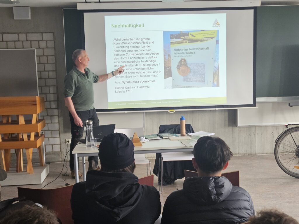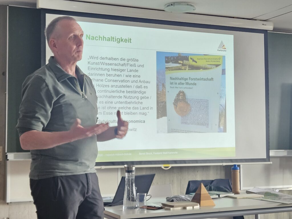 AHeute ist der Start der Nachhaltigkeitswochen an der Heinrich-Hübsch-Schule mit vielen interessanten Veranstaltungen, Workshops und Aktionen. Begonnen hat Bernd Struck, Förster beim Forstamt Karlsruhe mit dem Thema Zustand Wald, Klima, Anpflanzungen, Aufforstung, Wichtigkeit Wald, Waldbewirtschaftung und Entwicklung. In den kommenden zwei Wochen könnt ihr an zahlreichen Vorträgen, Aktionen usw. teilnehmen.
